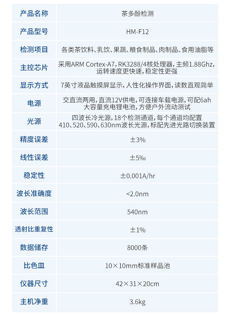 HM-F12茶多酚檢測(cè)儀可快速定量檢測(cè)各類茶飲料、乳飲、果蔬、糧食制品、肉制品、食用油脂等中茶多酚含量。茶多酚檢測(cè)儀可以廣泛應(yīng)用于產(chǎn)品質(zhì)量監(jiān)督檢驗(yàn)、工商管理、茶葉批發(fā)市場(chǎng)、茶葉0.深加工基地、飲料企業(yè)、超市、商場(chǎng)、各大食品安全監(jiān)測(cè)系統(tǒng)等部門(mén)。