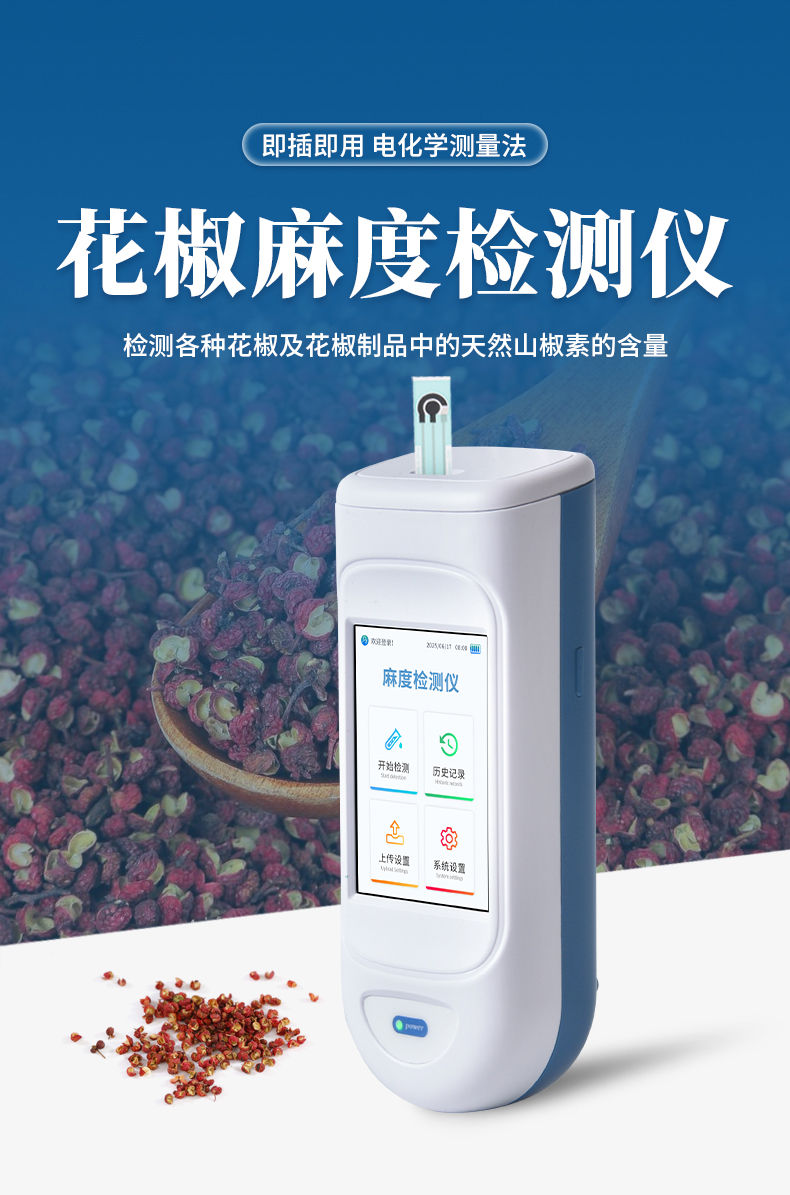 花椒麻度分析儀采用電化學(xué)測(cè)量方法,可快速、便捷地檢測(cè)各種花椒及花椒制品中的天然山椒素的含量,適用于干花椒、花椒油、花椒粉等花椒及其制品的快速檢測(cè)。