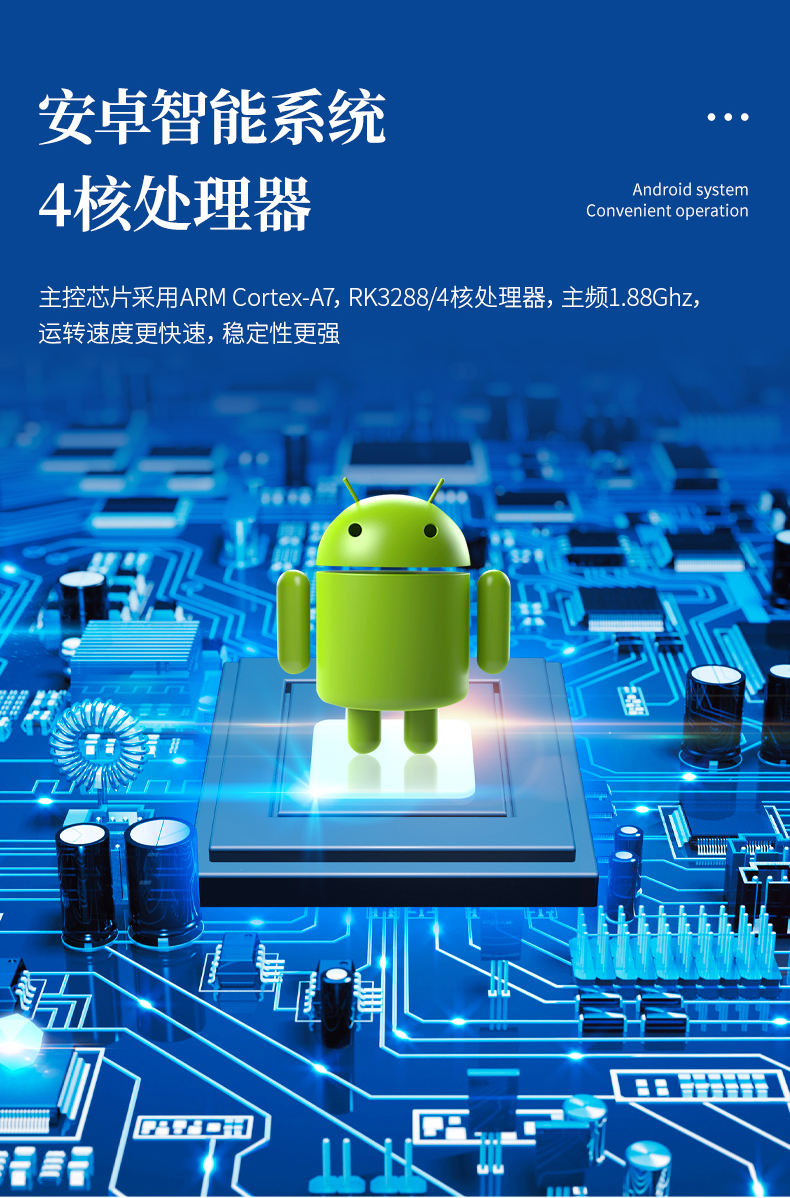 1、主控芯片采用ARM Cortex-A7,RK3288/4核處理器,主頻1.88Ghz,運轉(zhuǎn)速度更快速,穩(wěn)定性更強(qiáng)。