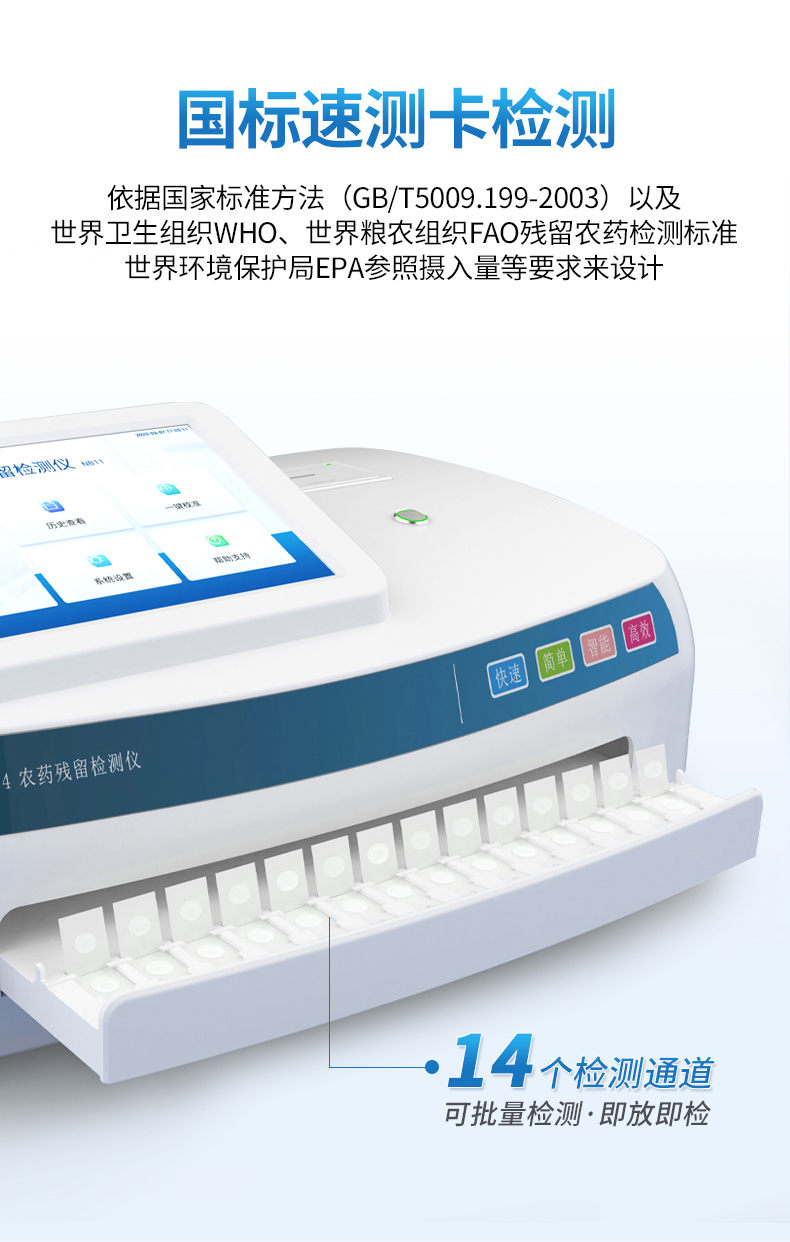 該儀器為恒美科技新研發(fā)一款農(nóng)殘快速檢測(cè)儀,采用國(guó)標(biāo)速測(cè)卡,使檢測(cè)速度更快,操作更加簡(jiǎn)便。檢測(cè)標(biāo)準(zhǔn):依據(jù)國(guó)家標(biāo)準(zhǔn)方法(GB/T5009.199-2003)以及世界衛(wèi)生組織WHO、世界糧農(nóng)組織FAO殘留農(nóng)藥檢測(cè)標(biāo)準(zhǔn)、世界環(huán)境保護(hù)局EPA參照攝入量等要求來(lái)設(shè)計(jì)。
