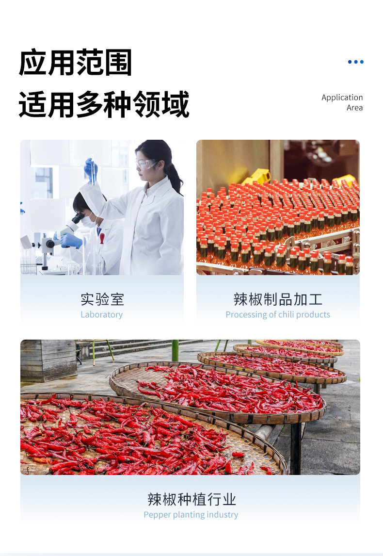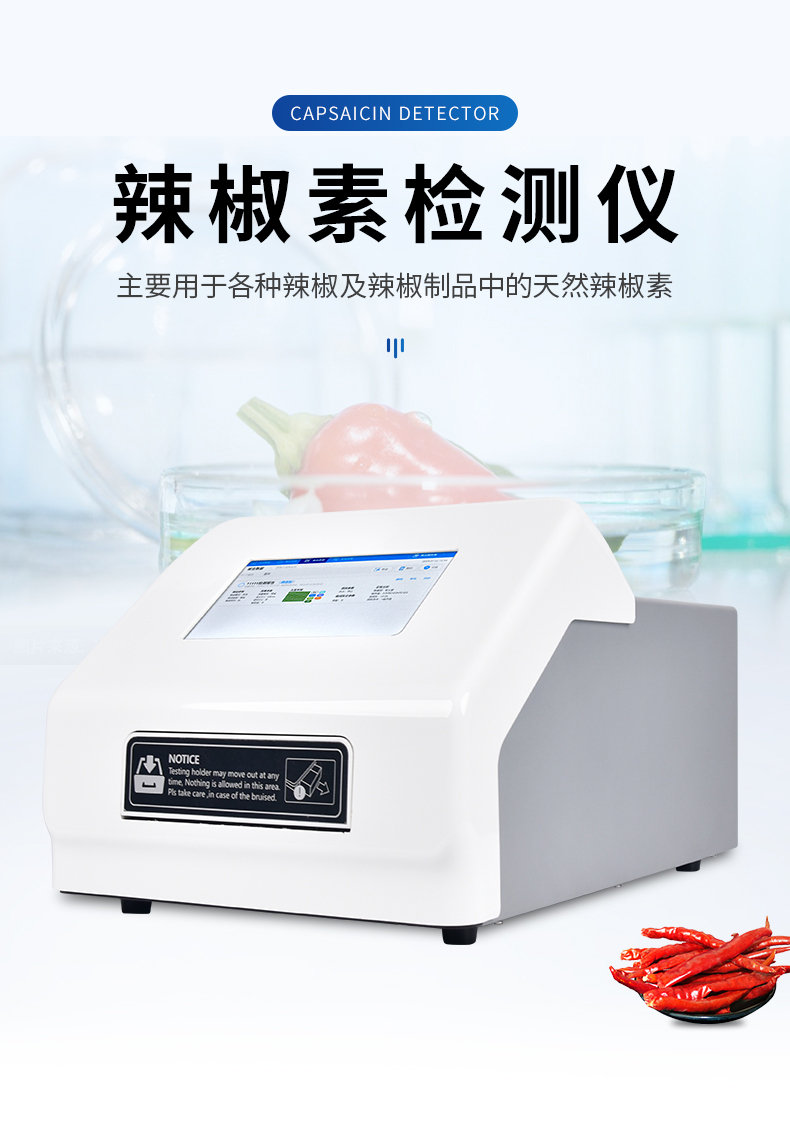 辣椒素檢測儀主要用于各種辣椒及辣椒制品中的天然辣椒素、辣度檢測。儀器由亮度發(fā)光二管光源、比色池、高靈敏度集成光電池、微處理器、漢字大屏幕液晶屏、嵌入式微型熱敏打印機(jī)集成芯片構(gòu)成,可直接在大屏幕液晶屏上顯示出被測樣品中相關(guān)指標(biāo)的含量,并打印出分析結(jié)果,還可以通過計算機(jī)接口將數(shù)據(jù)傳輸?shù)诫娔X進(jìn)行數(shù)據(jù)分析。