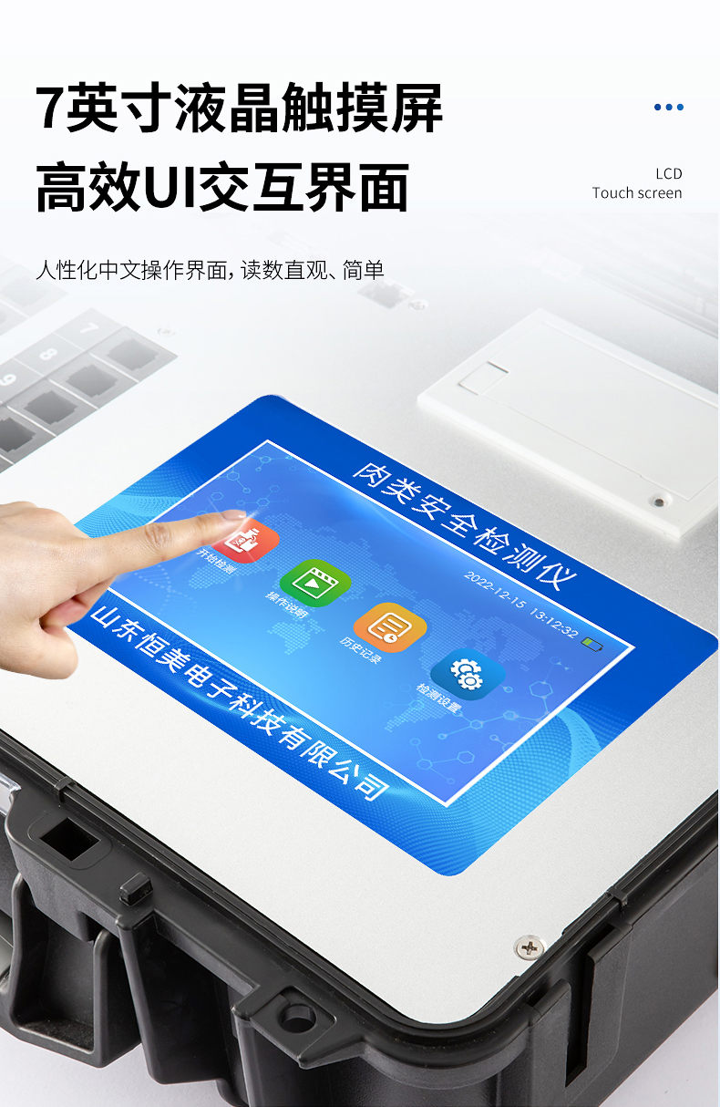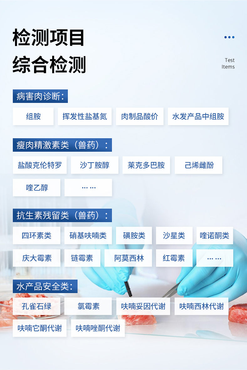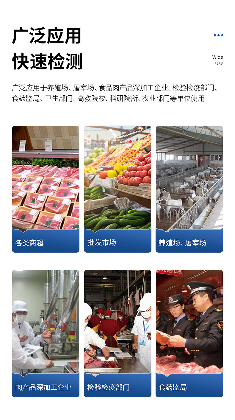 肉制品檢測儀可快速檢測幾十種項(xiàng)目,包含各種獸藥殘留:抗生素類殘留、瘦肉精激素類殘留;病害肉診斷:肉類新鮮度、肉中組胺、揮發(fā)性鹽基氮;水產(chǎn)品安全篩查等現(xiàn)場的定性定量檢測。