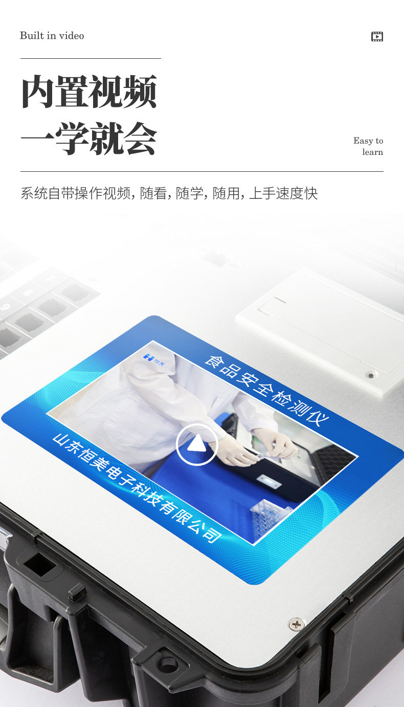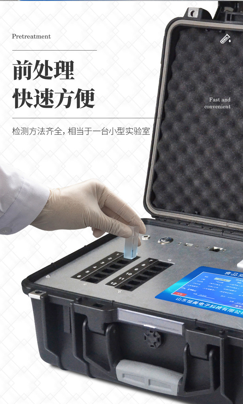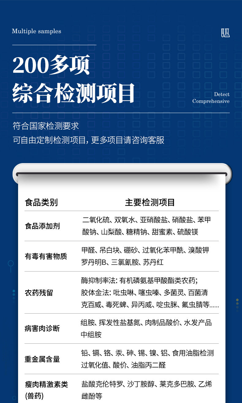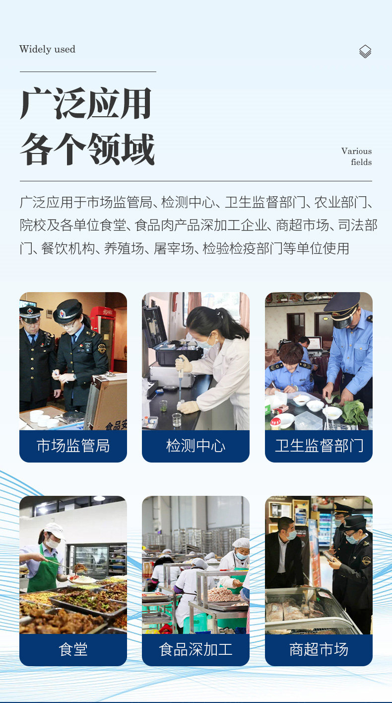 食品安全檢測設(shè)備可快速檢測200多項目,包含非食用化學(xué)物質(zhì)、濫用食品添加劑、農(nóng)藥殘留、獸藥殘留、重金屬、病害肉、營養(yǎng)強(qiáng)化劑、抗生素類殘留、激素類殘留、真菌毒素類殘留、化學(xué)類殘留等現(xiàn)場的定性定量檢測。