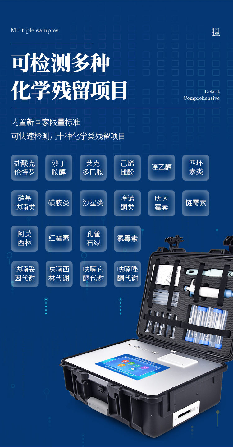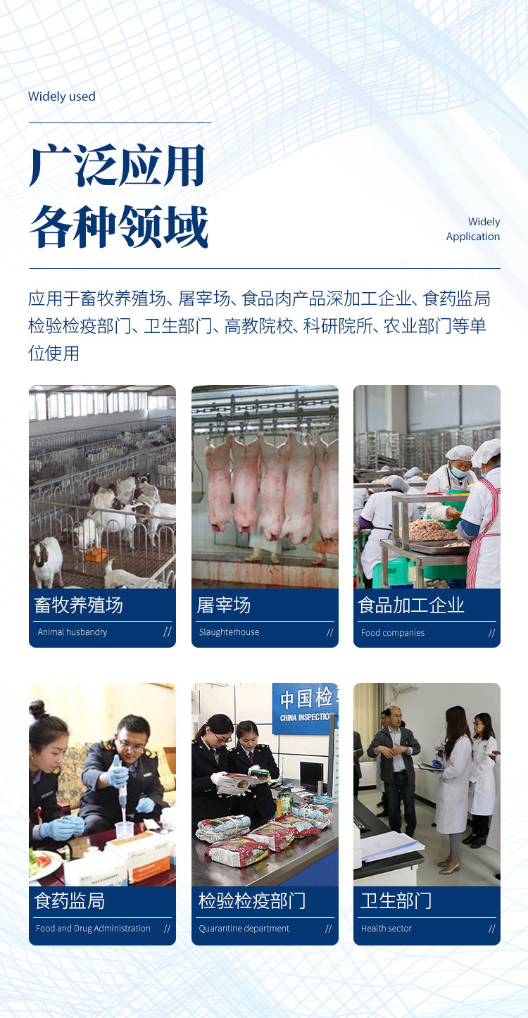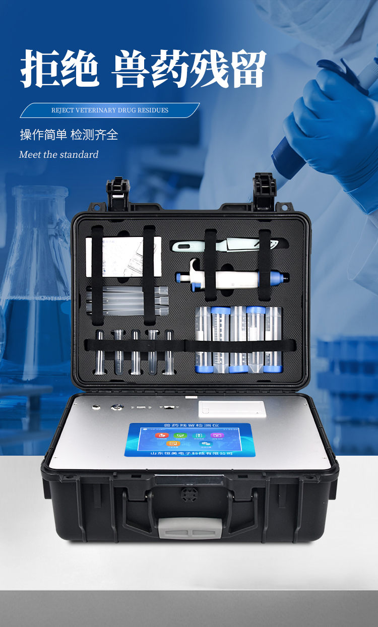 獸藥殘留檢測(cè)儀適用于豬、雞、鴨、羊、牛、牛奶等畜禽肉產(chǎn)品中獸藥殘留,包括抗生素類殘留、瘦肉精激素類殘留和水產(chǎn)品有毒有害物質(zhì)的現(xiàn)場(chǎng)快速篩查定及性定量檢測(cè)。