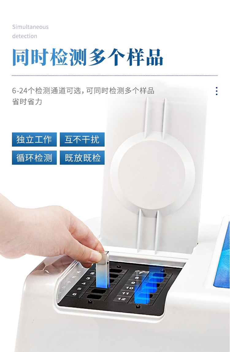 4、檢測通道:24個檢測通道,可以同時測試多個樣品,循環(huán)檢測,即放即檢,每個樣品由程序控制分別獨立工作,不會互相干擾。