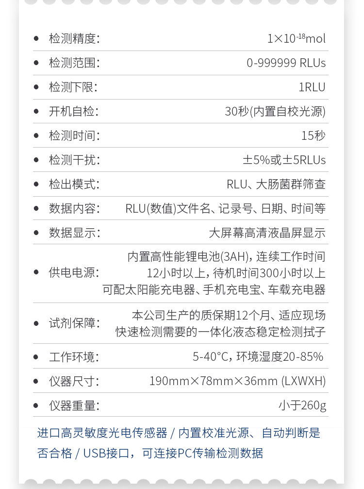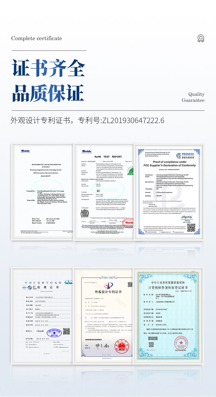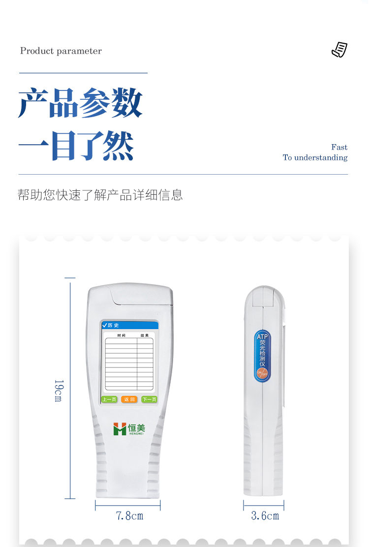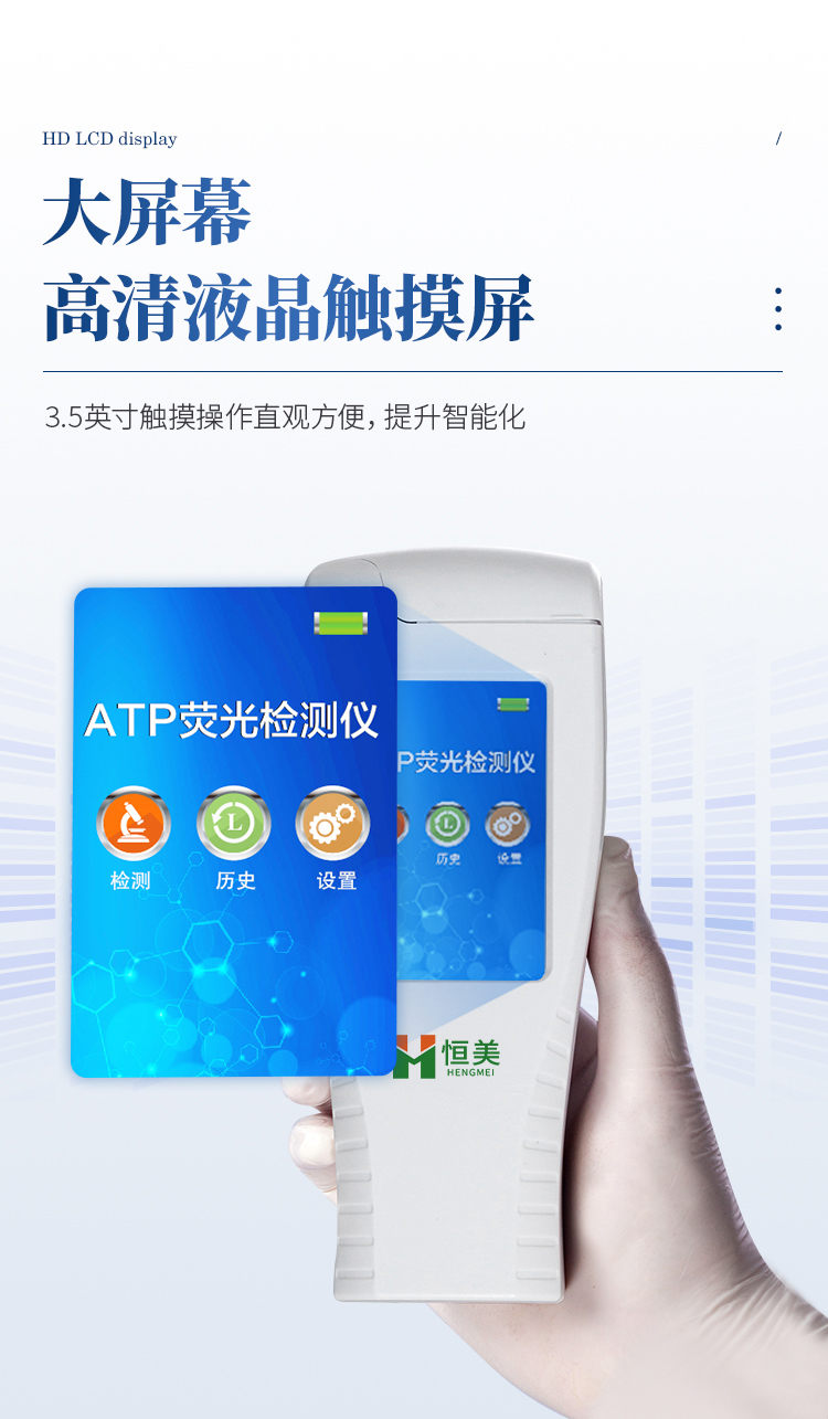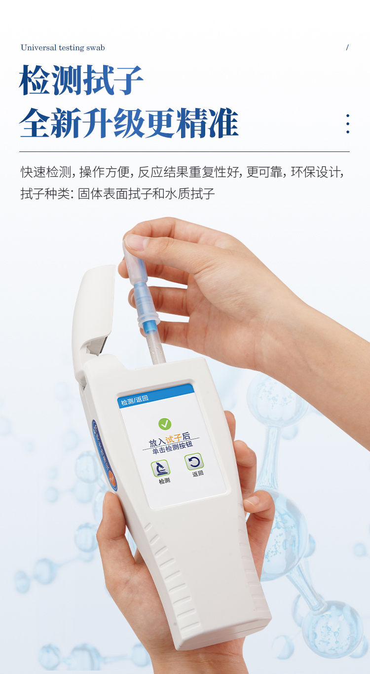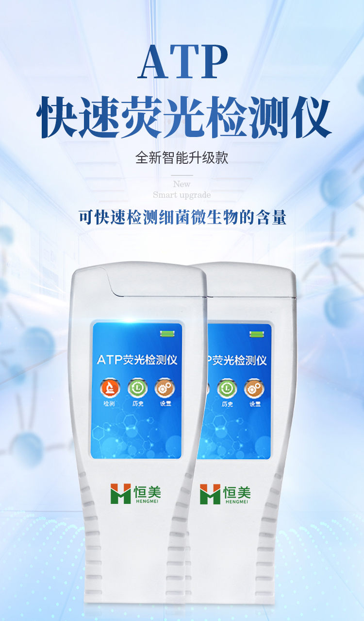 該設(shè)備為全新升級產(chǎn)品,大屏幕觸摸顯示屏,代替?zhèn)鹘y(tǒng)按鍵。操作采用生物化學(xué)反應(yīng)方法檢測ATP含量,微生物檢測儀器基于螢火蟲發(fā)光原理,利用“熒光素酶—熒光素體系”快速檢測三磷酸腺苷(ATP)。ATP拭子含有可以裂解細胞膜的試劑,能將細胞內(nèi)ATP釋放出來,與試劑中含有的特異性酶發(fā)生反應(yīng),產(chǎn)生光,再用熒光照度計檢測發(fā)光值,微生物的數(shù)量與發(fā)光值成正比,由于所有生物活細胞中含有恒量的ATP,所以ATP含量可以清晰地表明樣品中微生物與其他生物殘余的多少,用于判斷衛(wèi)生狀況。