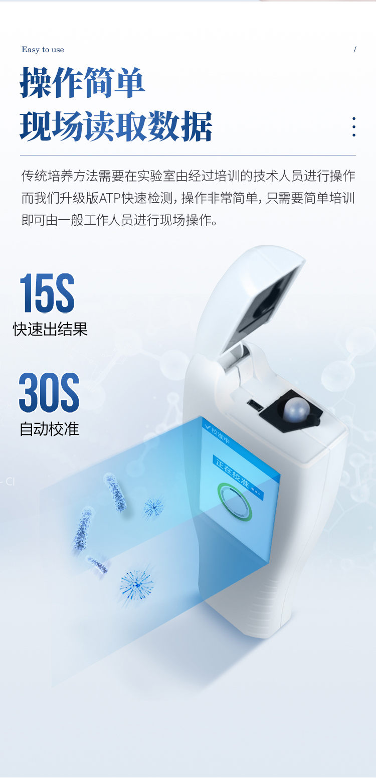可操作性 —— 傳統(tǒng)培養(yǎng)方法需要在實驗室由經(jīng)過培訓(xùn)的技術(shù)人員進行操作;而ATP快速潔凈度檢測操作非常簡便,只需簡單的培訓(xùn)即可由一般工作人員進行現(xiàn)場操作。