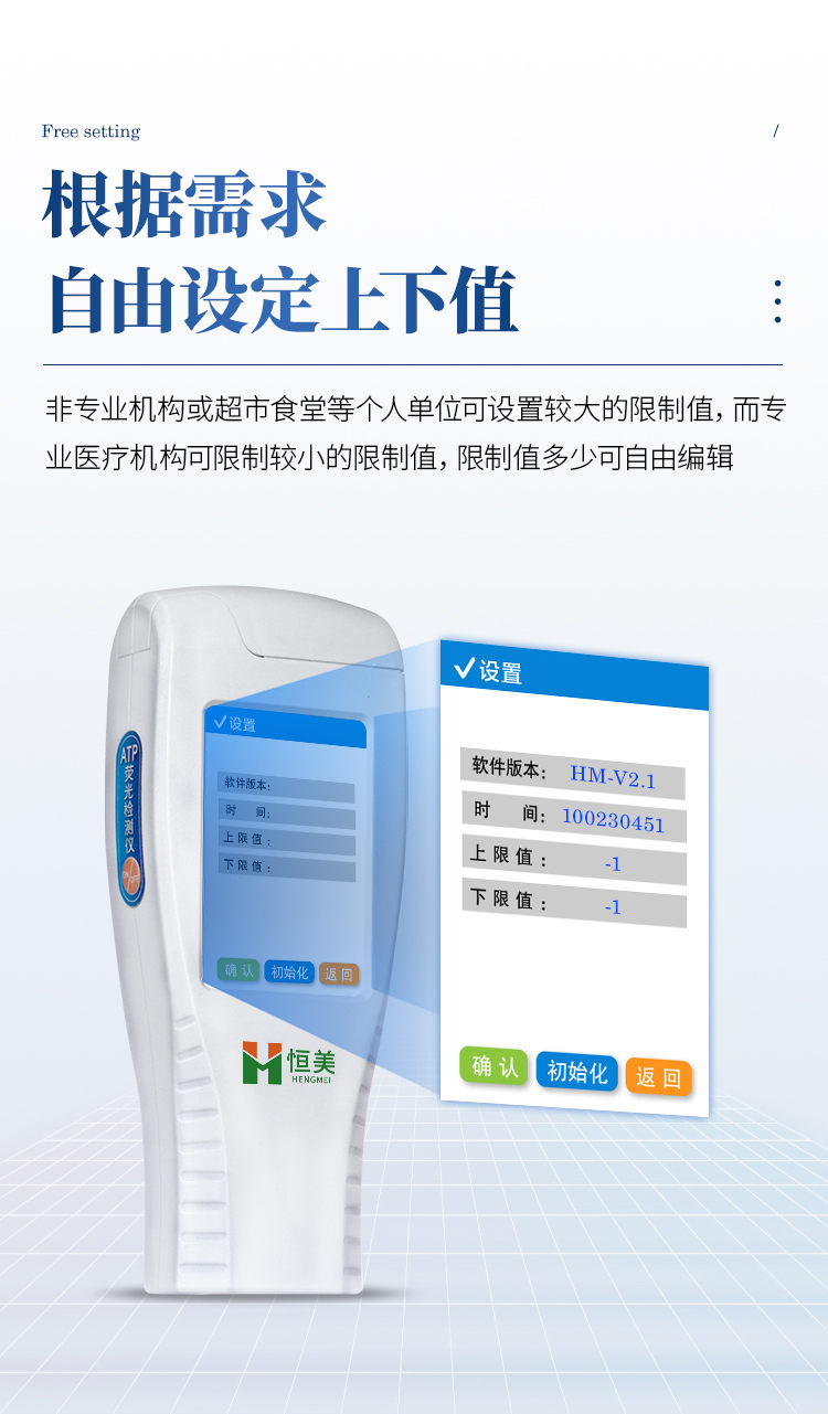 實用性 —— 可根據(jù)環(huán)境檢測需求設(shè)定上下限值,做到數(shù)據(jù)快速評估預(yù)警,表面潔凈度快速篩查。
