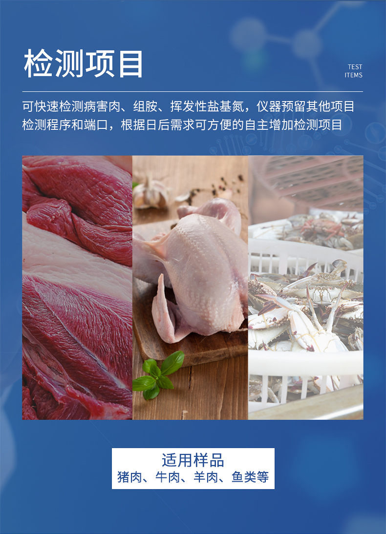 可快速檢測(cè)病害肉中揮發(fā)性鹽基氮,儀器預(yù)留其他項(xiàng)目檢測(cè)程序和端口,根據(jù)日后需求可方便的自主增加檢測(cè)項(xiàng)目。