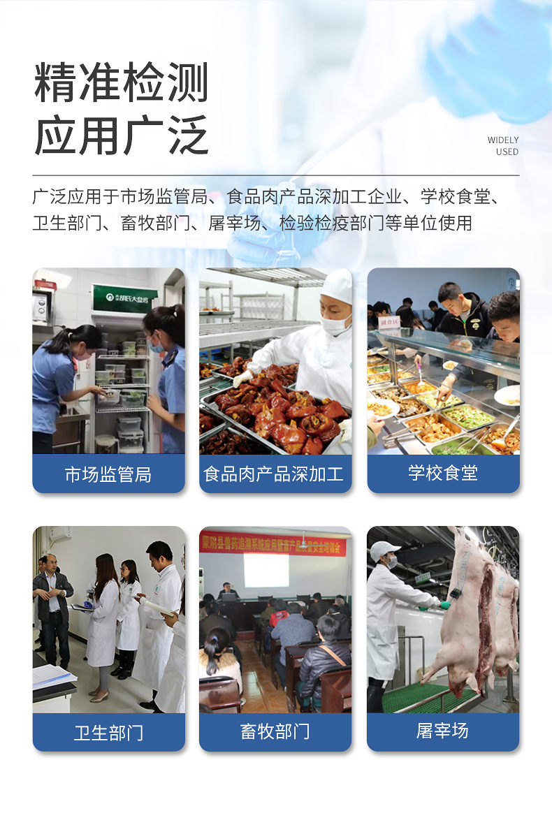 該多功能食品安全檢測(cè)儀為集成一體化食品安全快速檢測(cè)分析設(shè)備,廣泛應(yīng)用于食藥監(jiān)局、衛(wèi)生部門(mén)、高教院校、科研院所、農(nóng)業(yè)部門(mén)、養(yǎng)殖場(chǎng)、屠宰場(chǎng)、食品肉產(chǎn)品深加工企業(yè)、檢驗(yàn)檢疫部門(mén)等單位使用。