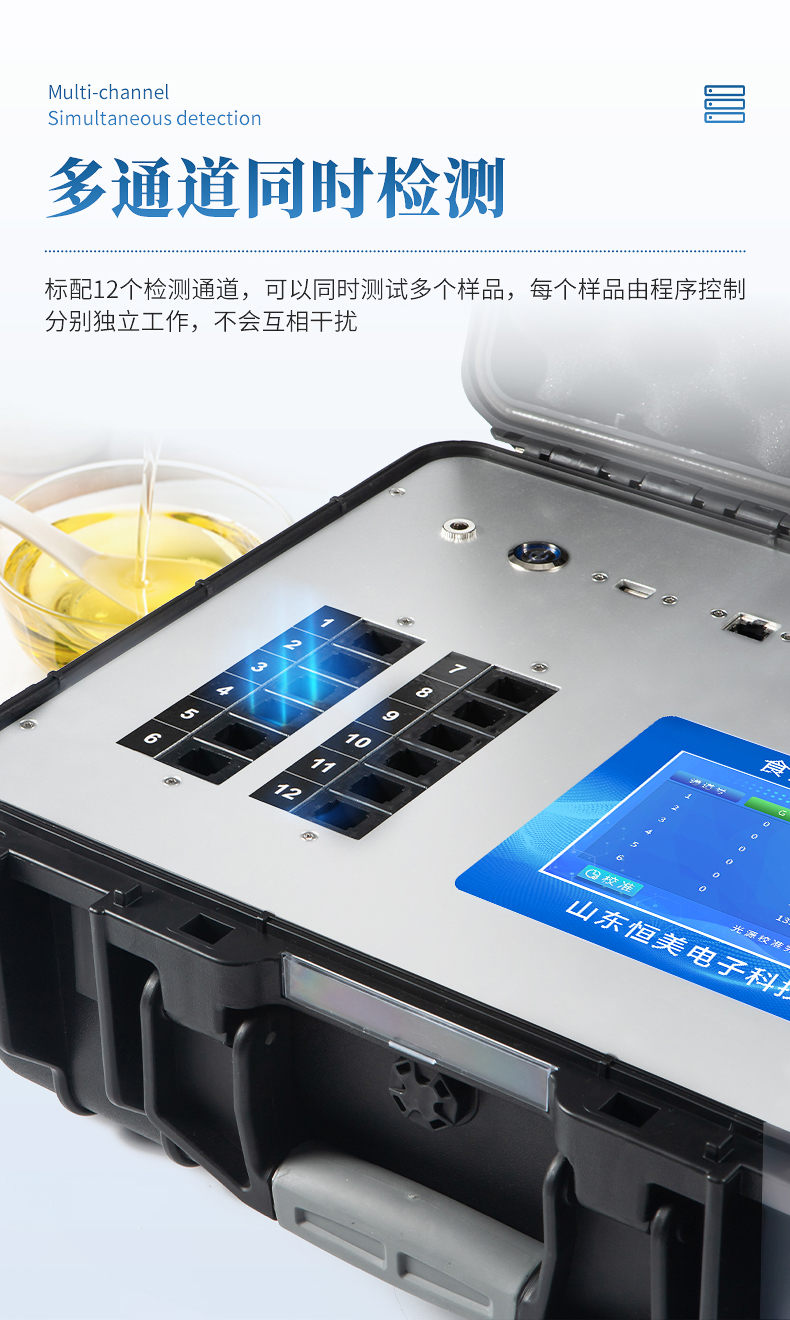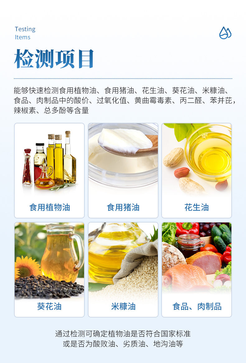 食用油綜合檢測(cè)儀為集成化油品快速檢測(cè)分析設(shè)備,能夠快速檢測(cè)食用植物油、食用豬油、花生油、葵花油、米糠油、食品、肉制品中的酸價(jià)、過(guò)氧化值、黃曲霉毒素等含量;通過(guò)檢測(cè)可確定植物油是否符合國(guó)家標(biāo)準(zhǔn)或是否為酸敗油、劣質(zhì)油、地溝油等。儀器預(yù)留其他項(xiàng)目檢測(cè)程序和端口,根據(jù)日后需求可方便的自主增加檢測(cè)項(xiàng)目。日后可升級(jí)為檢測(cè)水產(chǎn)品、面制品的綜合類(lèi)型儀器。