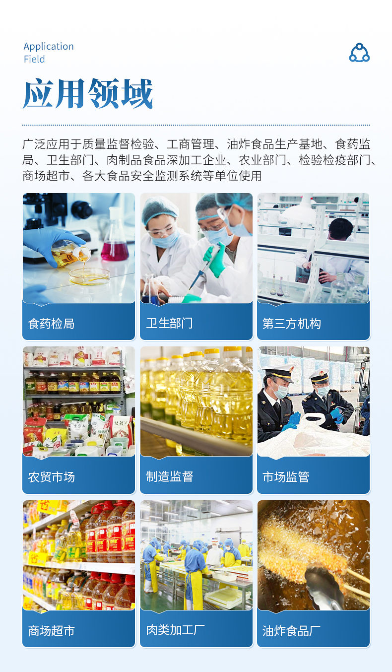 廣泛應(yīng)用于質(zhì)量監(jiān)督檢驗(yàn)、工商管理、油炸食品生產(chǎn)基地、食藥監(jiān)局、衛(wèi)生部門(mén)、肉制品食品深加工企業(yè)、農(nóng)業(yè)部門(mén)、檢驗(yàn)檢疫部門(mén)、商場(chǎng)超市、各大食品安全監(jiān)測(cè)系統(tǒng)等單位使用。