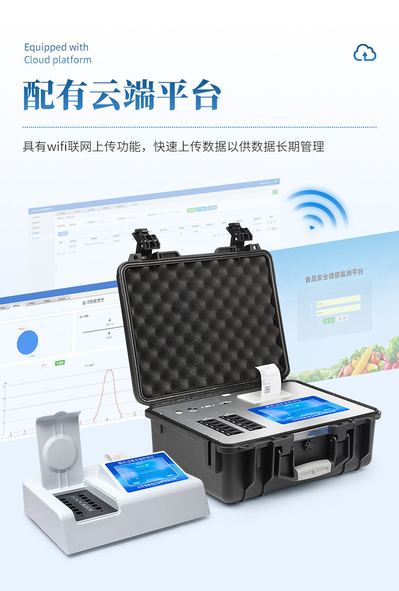 4、儀器帶有監(jiān)管平臺(tái),數(shù)據(jù)可局域網(wǎng)和互聯(lián)網(wǎng)數(shù)據(jù)上傳,檢測(cè)結(jié)果直接傳至食品安全監(jiān)管平臺(tái)。進(jìn)行區(qū)域食品安全監(jiān)管及大數(shù)據(jù)分析處理與數(shù)據(jù)統(tǒng)計(jì),檢測(cè)區(qū)域食品安全長(zhǎng)短期動(dòng)態(tài),達(dá)到食品安全問(wèn)題預(yù)估、預(yù)警