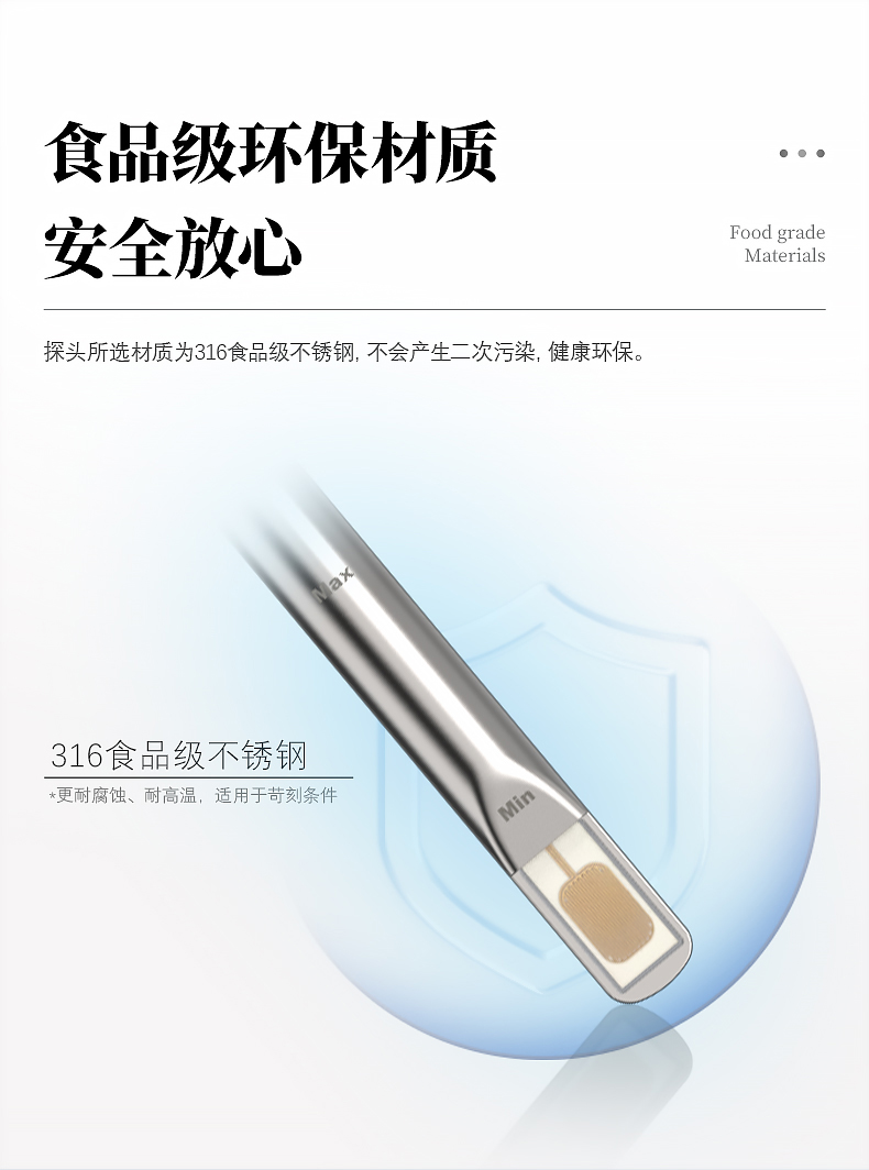 ■沒有二次污染 探頭所選材質(zhì)均為食品級環(huán)保材質(zhì),不會產(chǎn)生二次污染。
