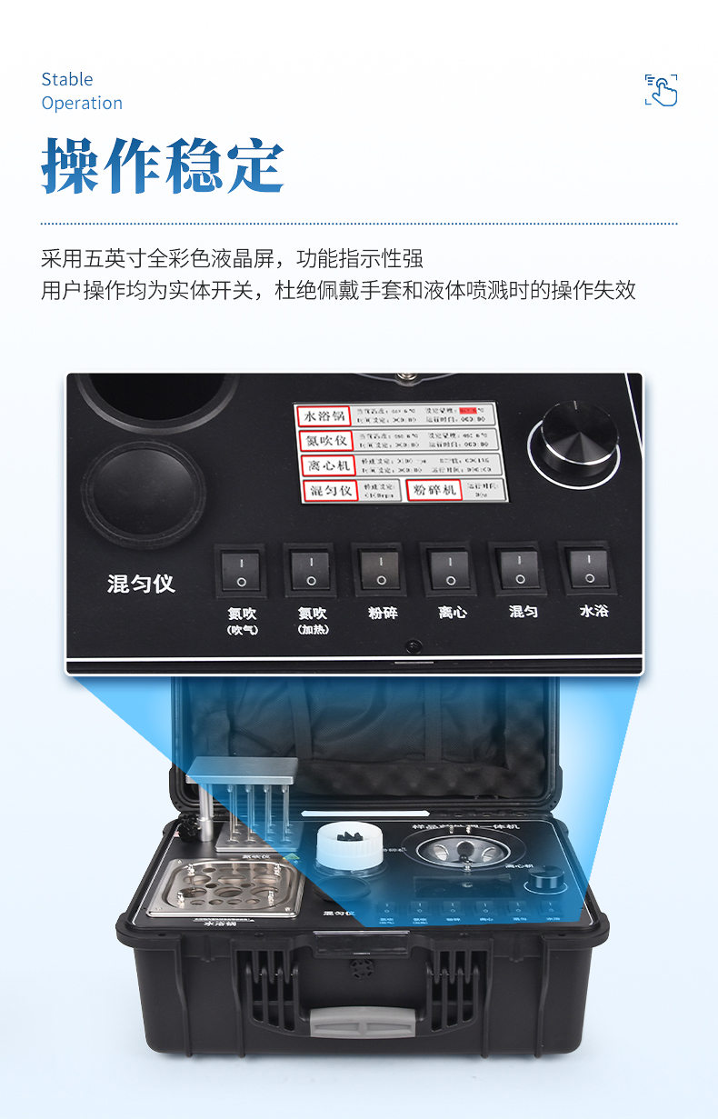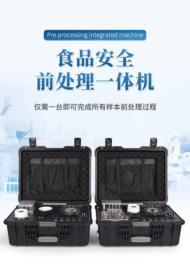 QC4型四合一樣品檢測(cè)前處理一體機(jī)(箱)是集吹干、離心、均質(zhì)、混勻功能的一體化整合,極大的簡(jiǎn)化和集中樣品前處理的一般操作過(guò)程,結(jié)合移動(dòng)便攜的工程塑料箱體,特別適合農(nóng)獸藥殘留畜禽水產(chǎn)品質(zhì)量安全現(xiàn)場(chǎng)快速檢測(cè)。