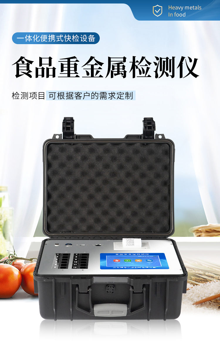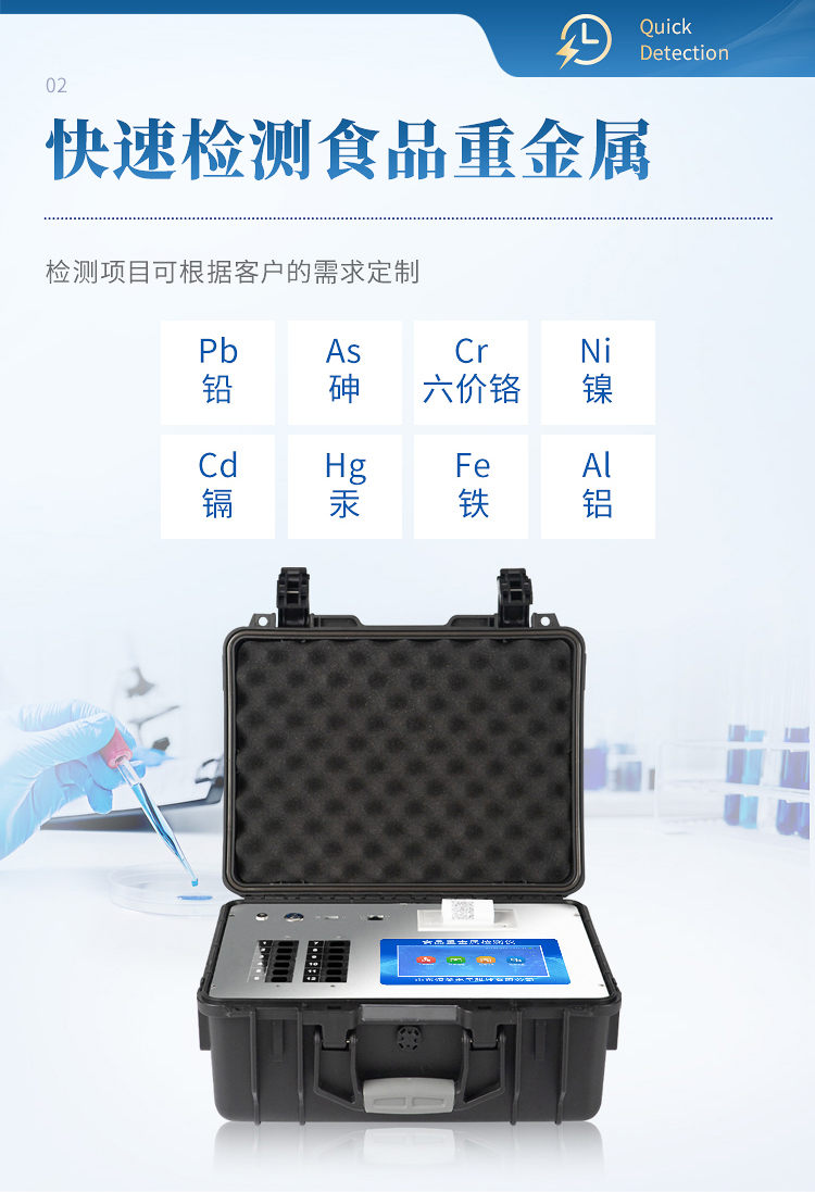 食品重金屬快速檢測儀可廣泛應用于大米、糧谷、果品、蔬菜、藥材、水質、水產品中重金屬鉛、鎘、六價鉻、汞、砷、鐵、鎳、鋁的快速檢測,檢測項目可根據(jù)客戶的需求定制。