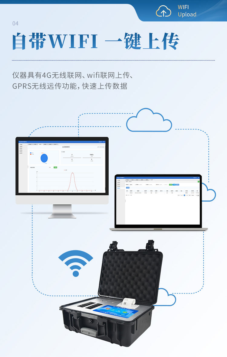 3、儀器具有4G無線聯(lián)網(wǎng)、wifi聯(lián)網(wǎng)上傳、GPRS無線遠傳功能,快速上傳數(shù)據(jù)。